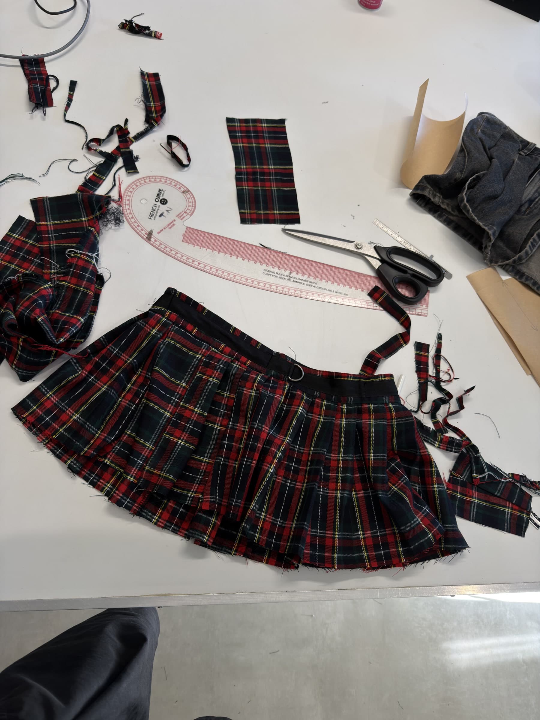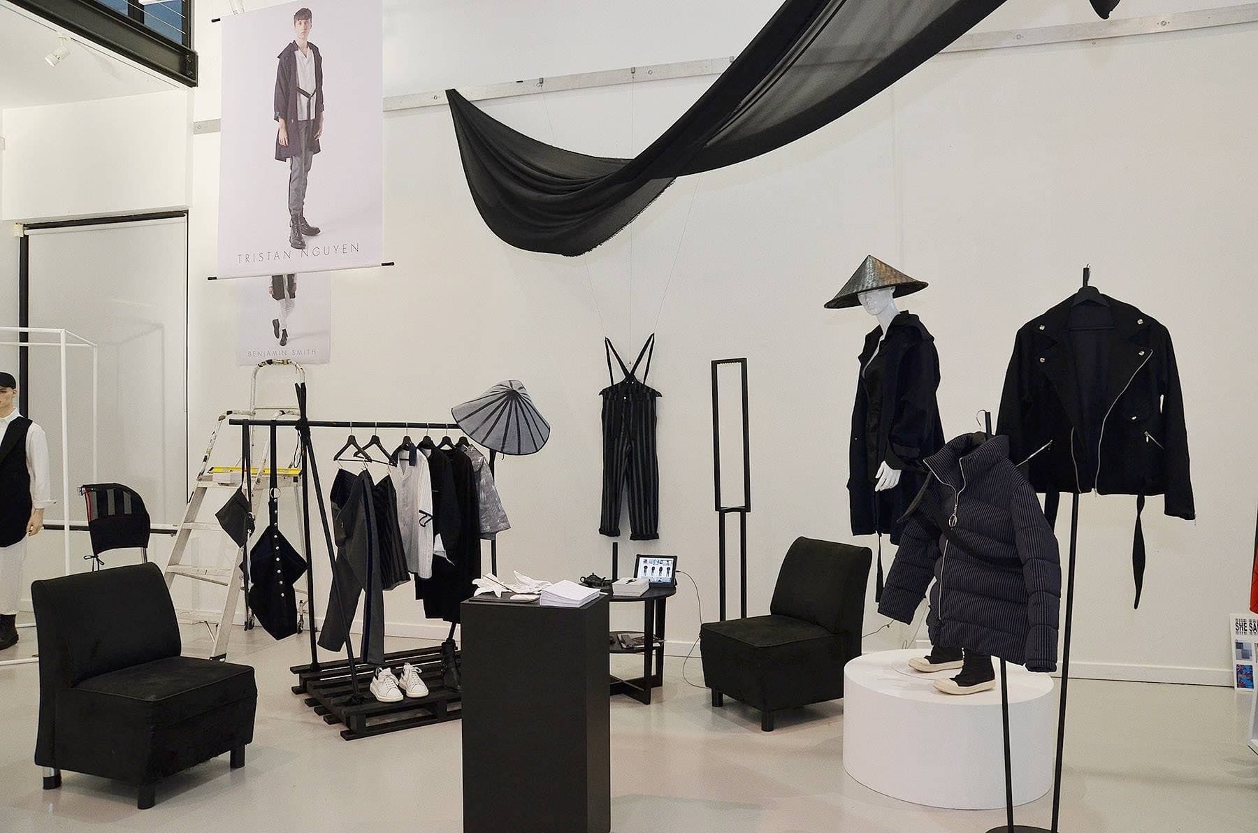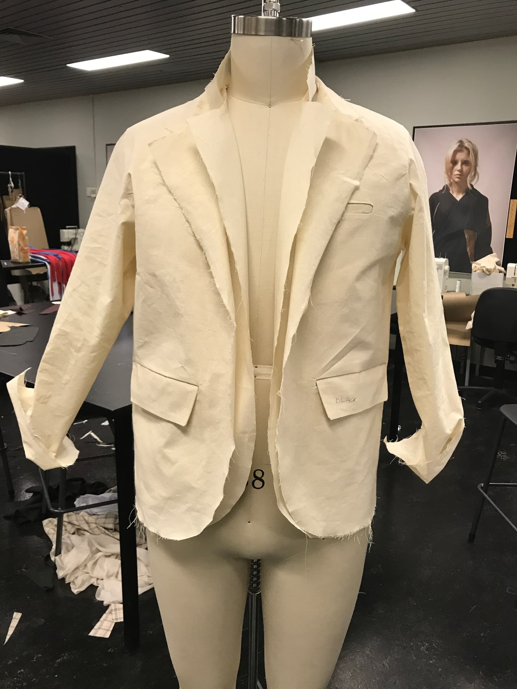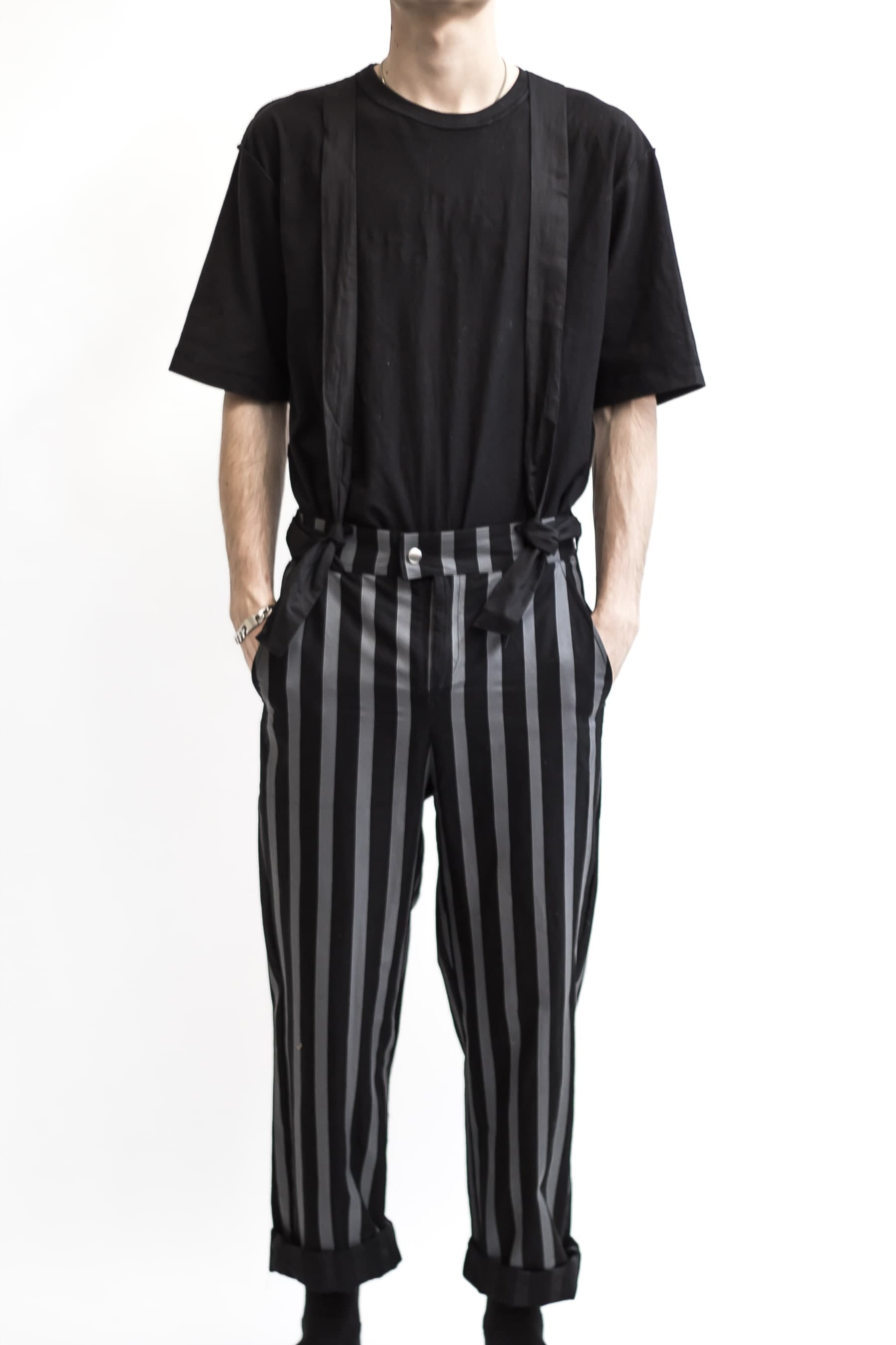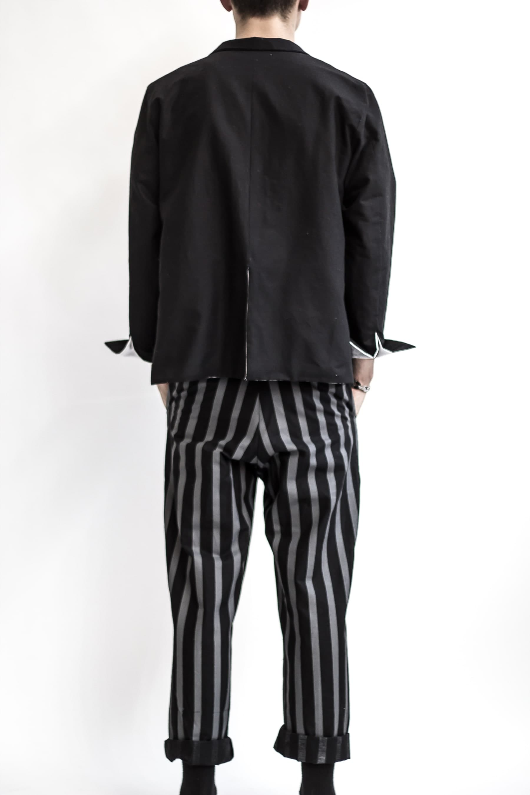 Layering study. Proportion, volume, and the weight of cloth when worn together. Hand-printed stripe suspended trousers, reversible gakuran-inspired blazer.