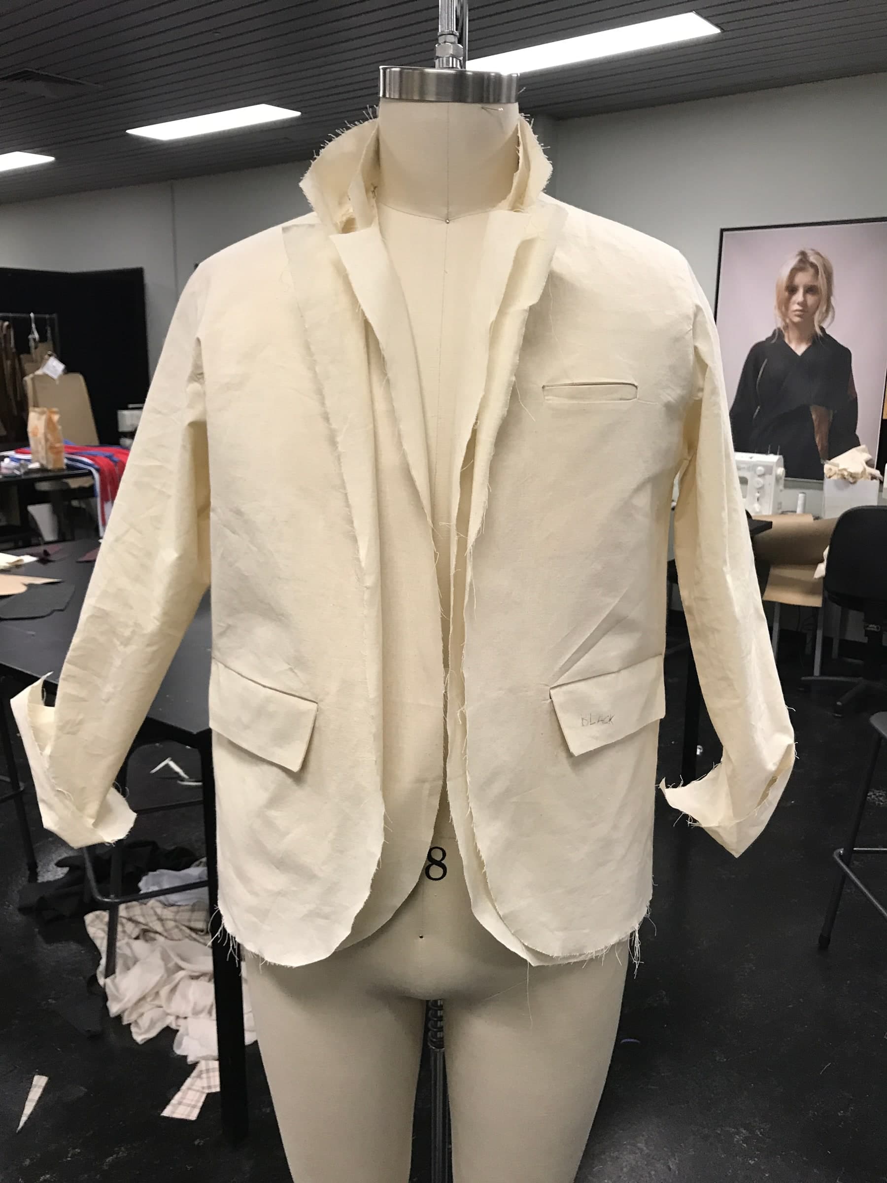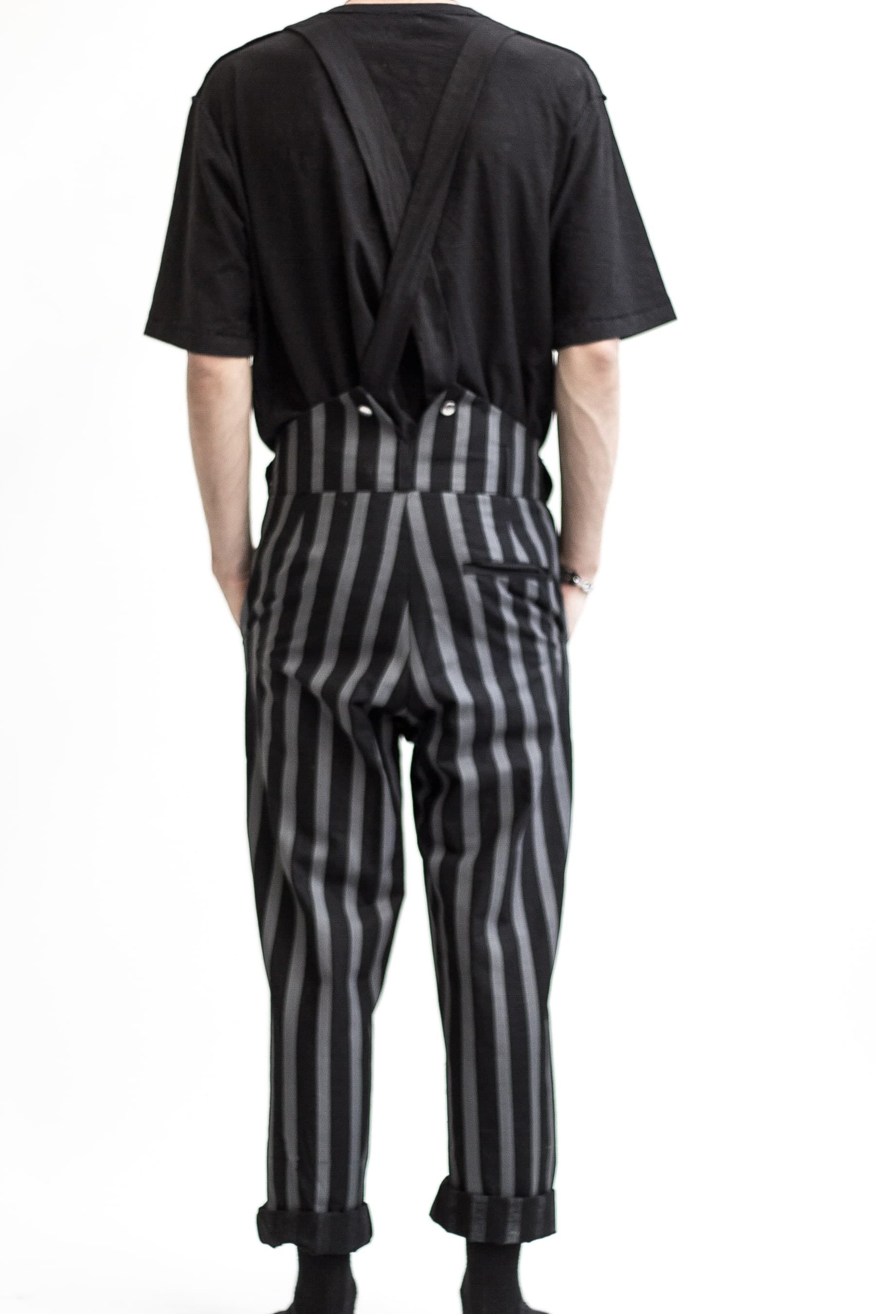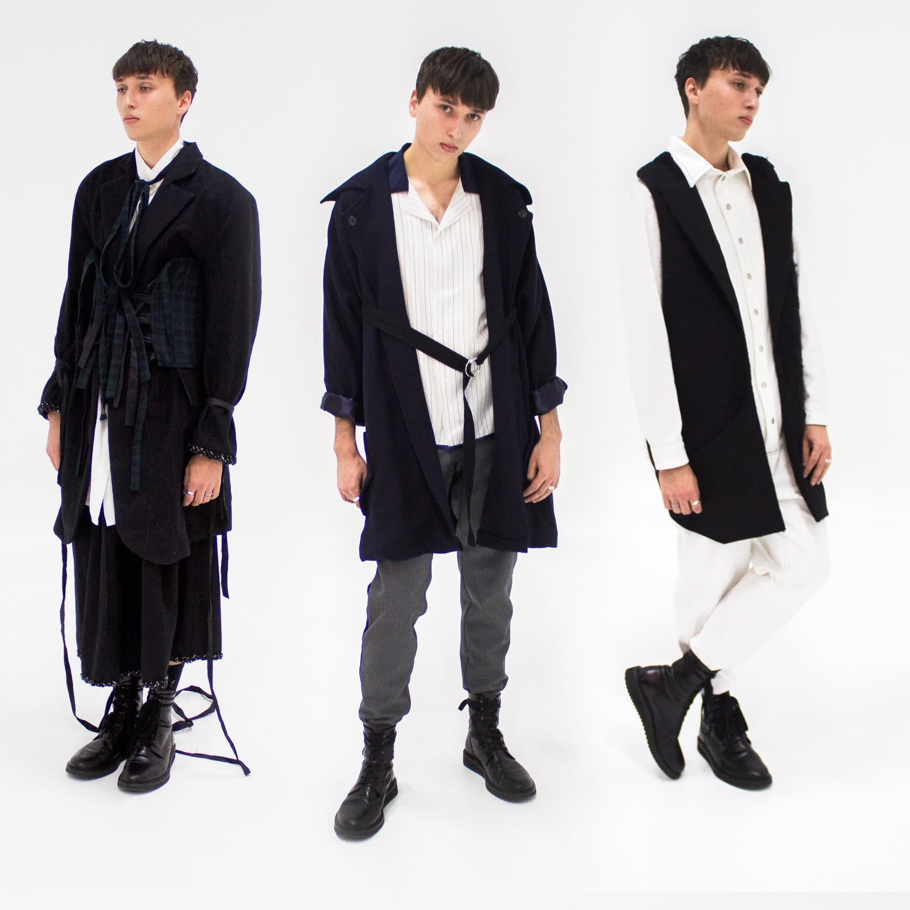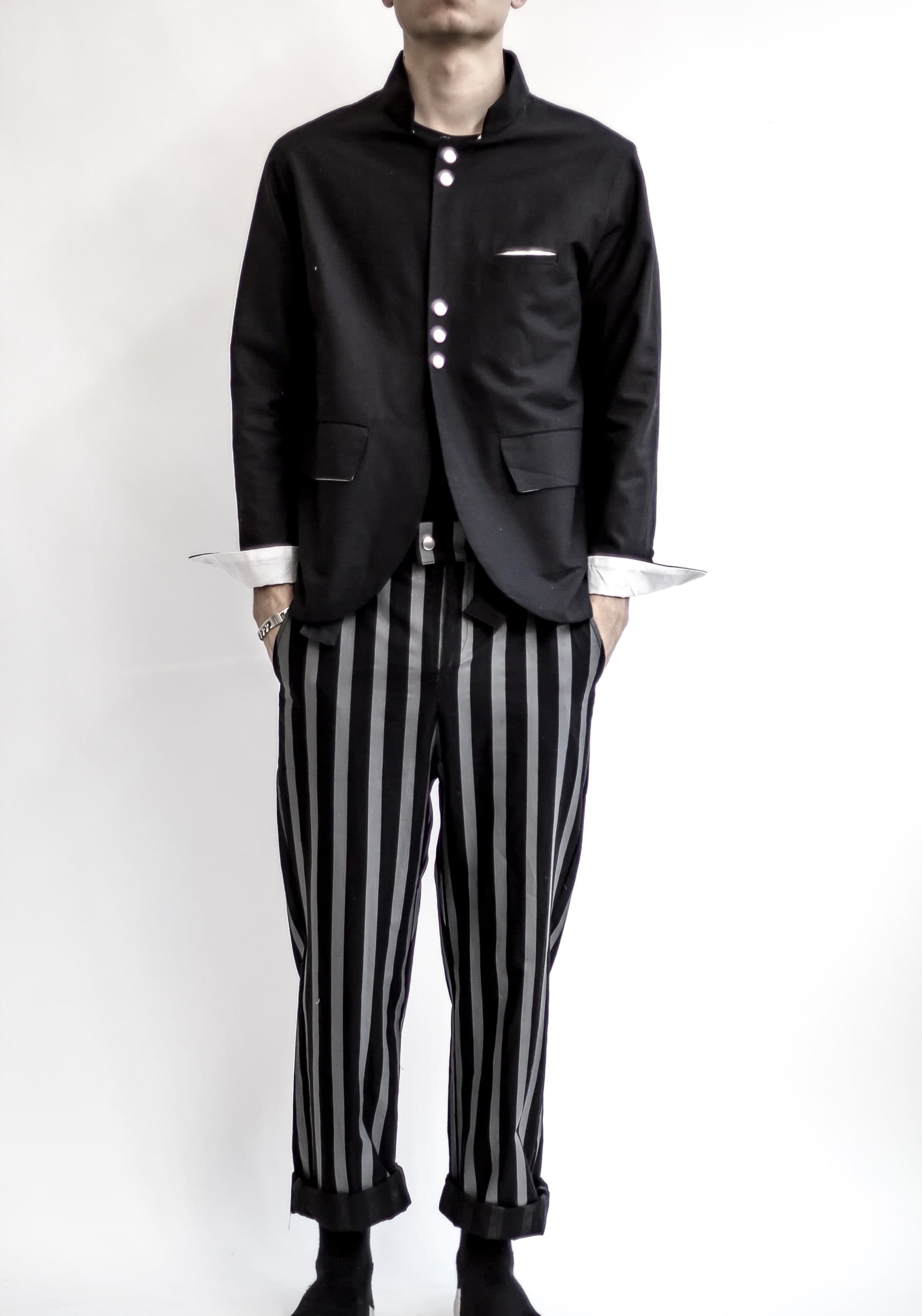 Layering study. Proportion, volume, and the weight of cloth when worn together. Hand-printed stripe suspended trousers, reversible gakuran-inspired blazer.