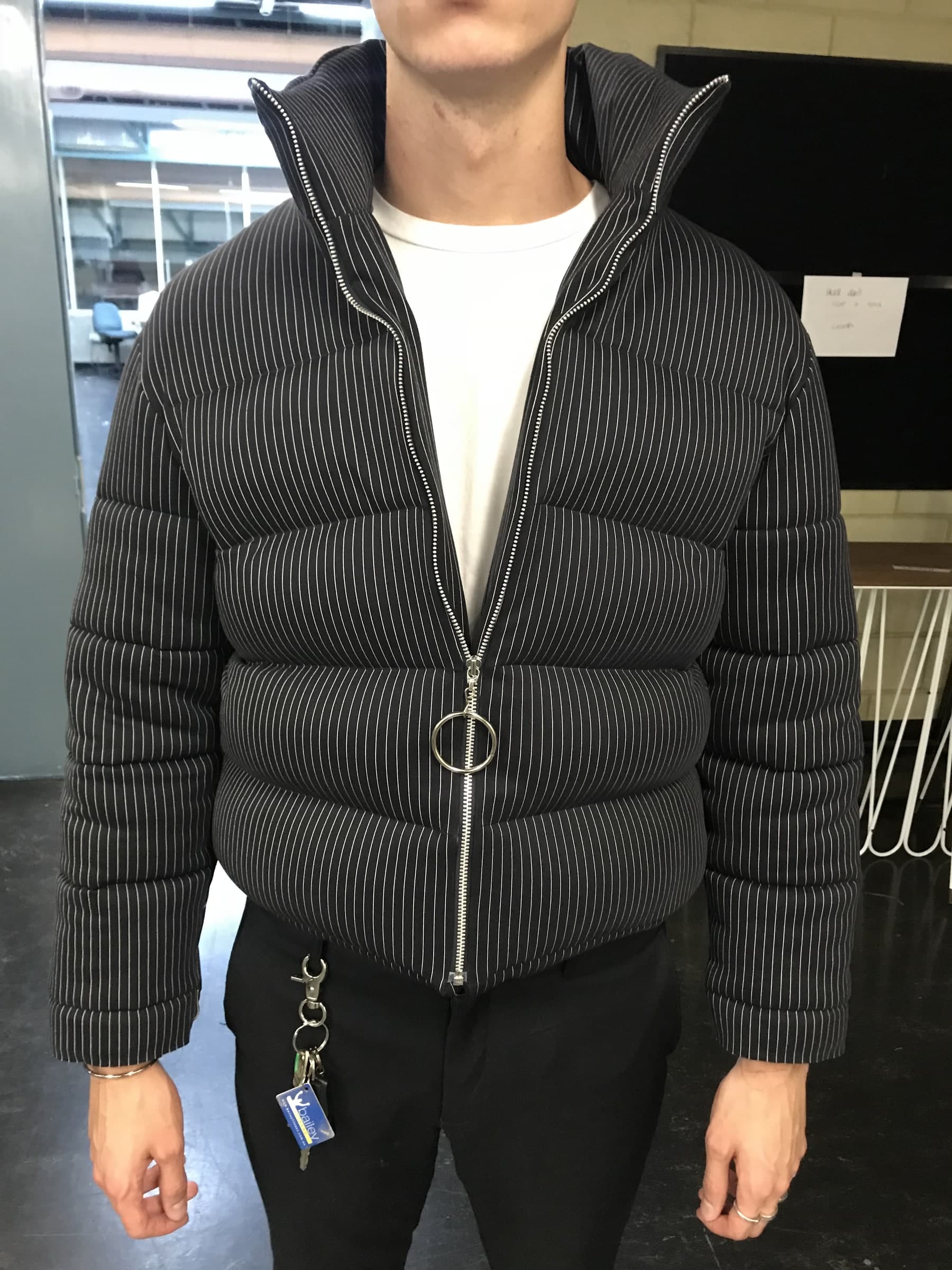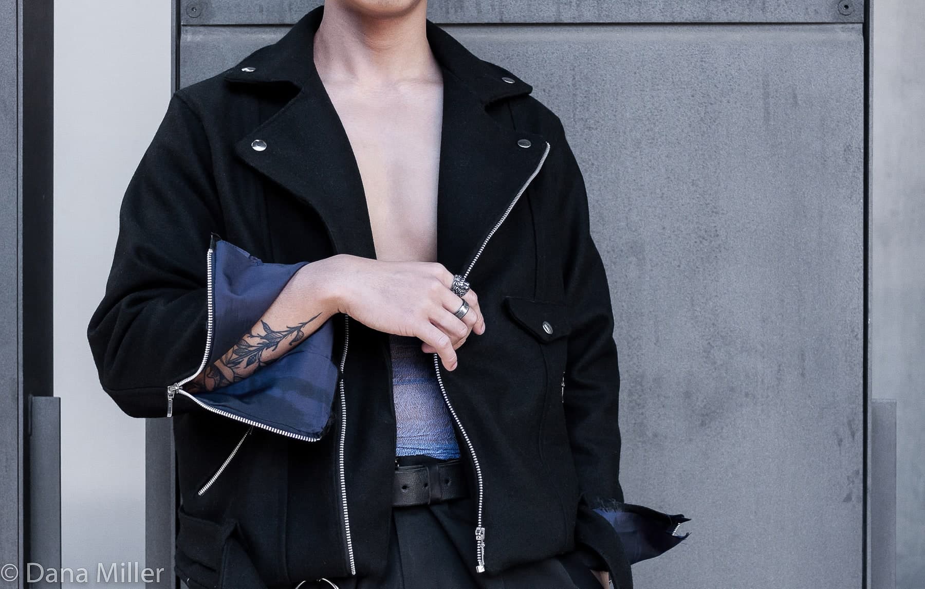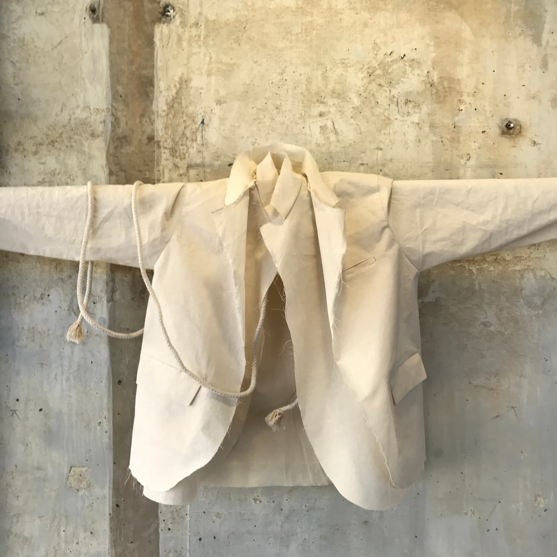 Layering study. Proportion, volume, and the weight of cloth when worn together. Hand-printed stripe suspended trousers, reversible gakuran-inspired blazer.