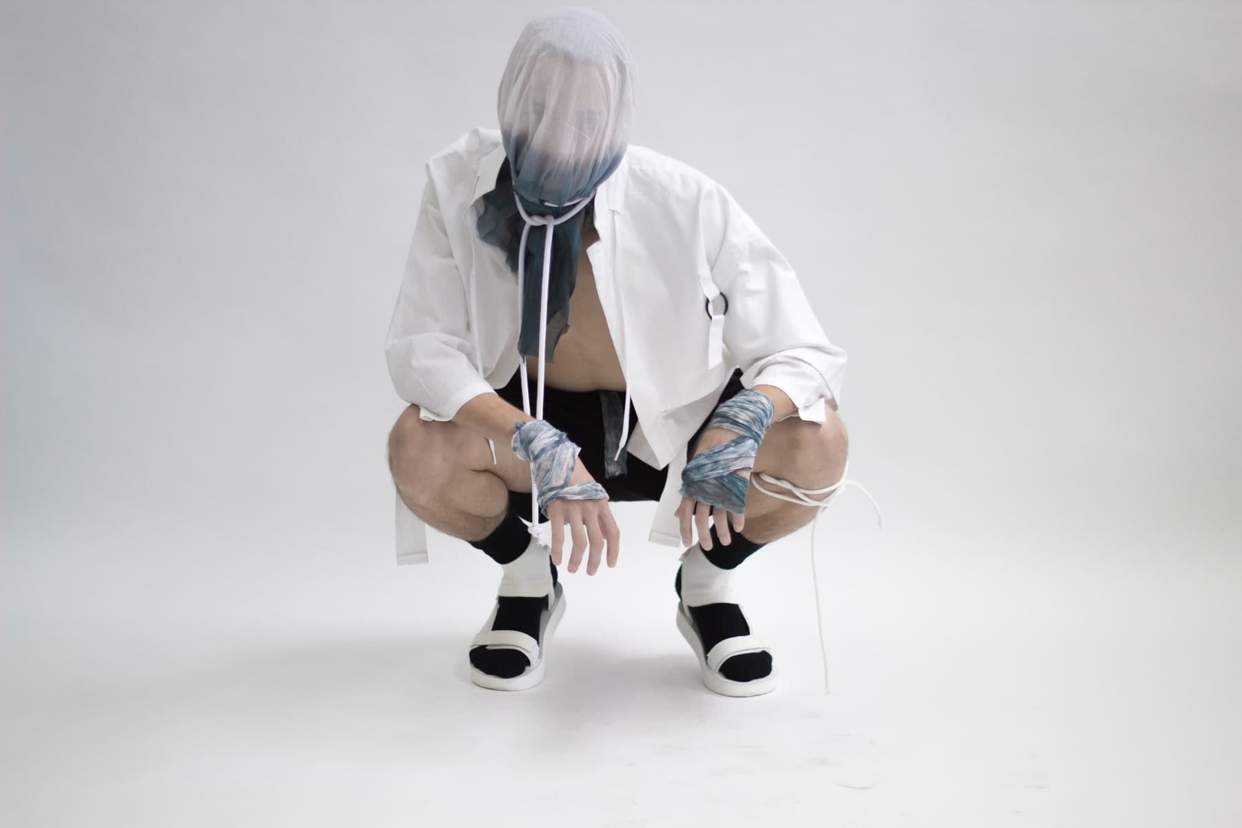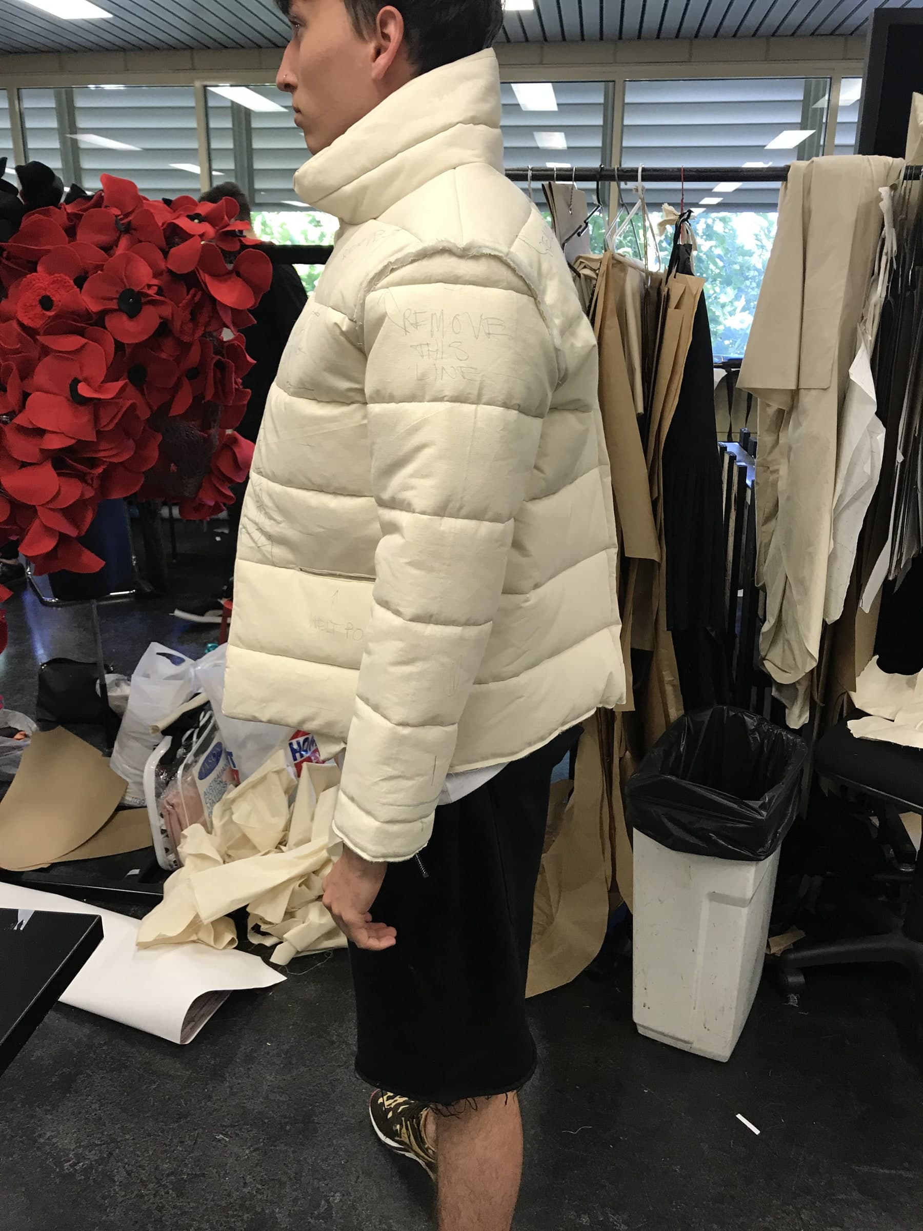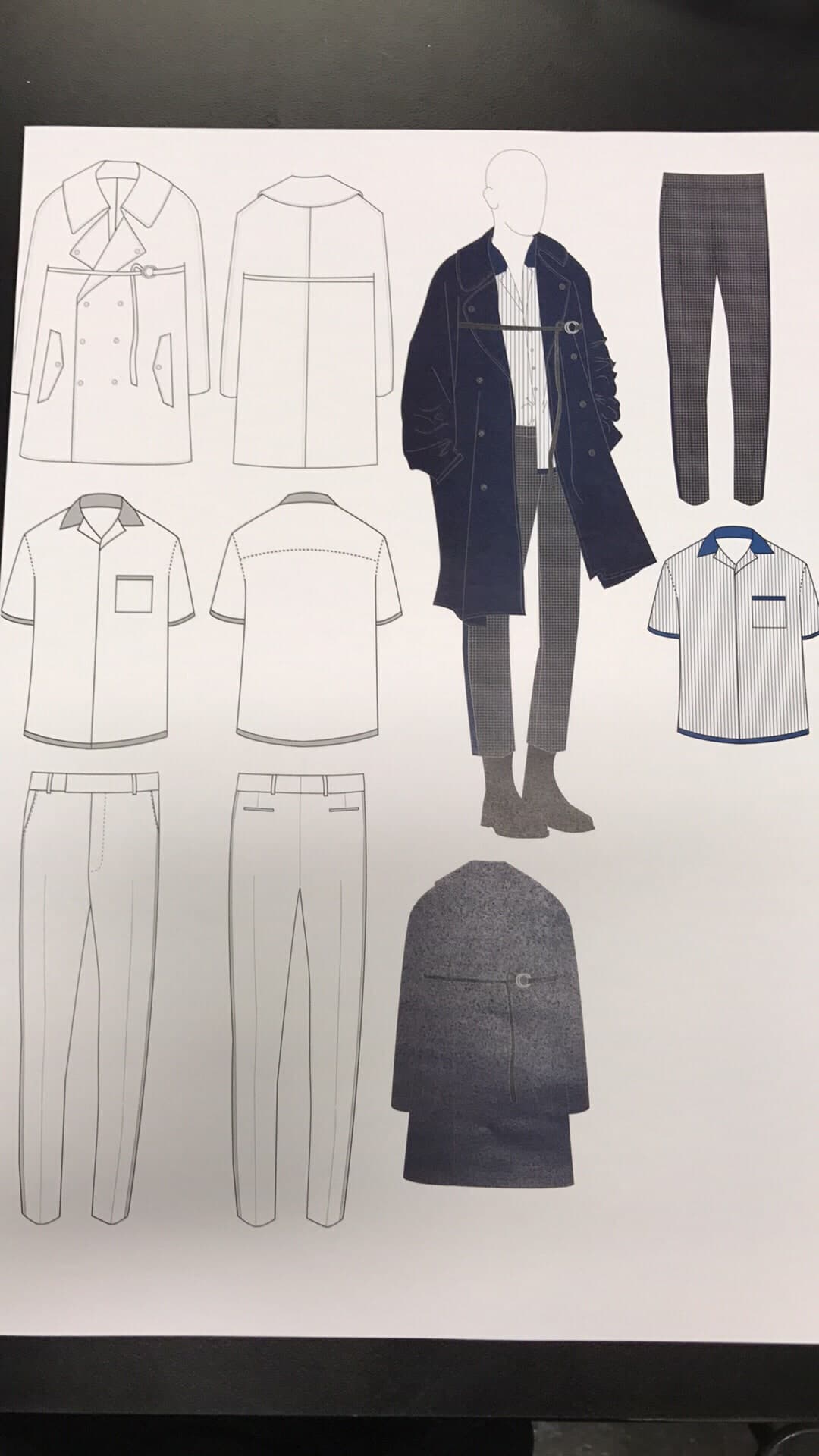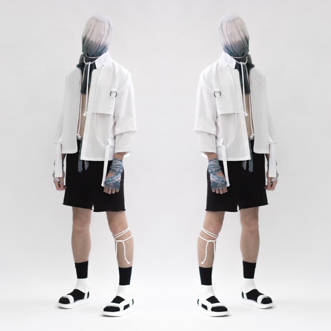 Layering study. Proportion, volume, and the weight of cloth when worn together. Hand-printed stripe suspended trousers, reversible gakuran-inspired blazer.